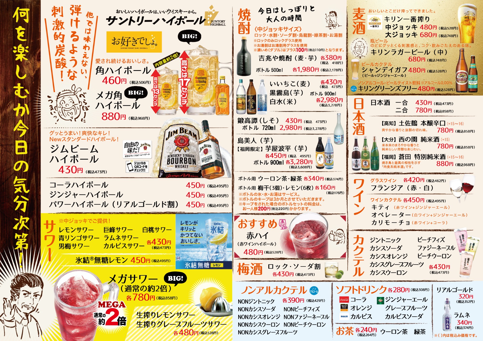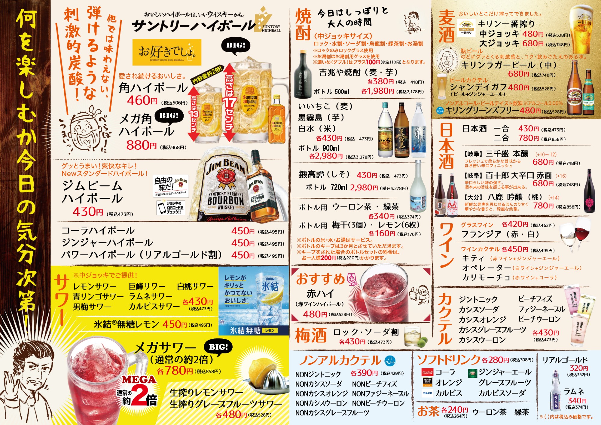 ウーロン茶・緑茶 各240円 ソフトドリンク ・カルピス・カルピスソーダ・コーラ・ジンジャーエール・オレンジ・グレープフルーツ 各280円 リアルゴールド320円 ラムネ340円 キリングリーンズフリー480円(税抜き)